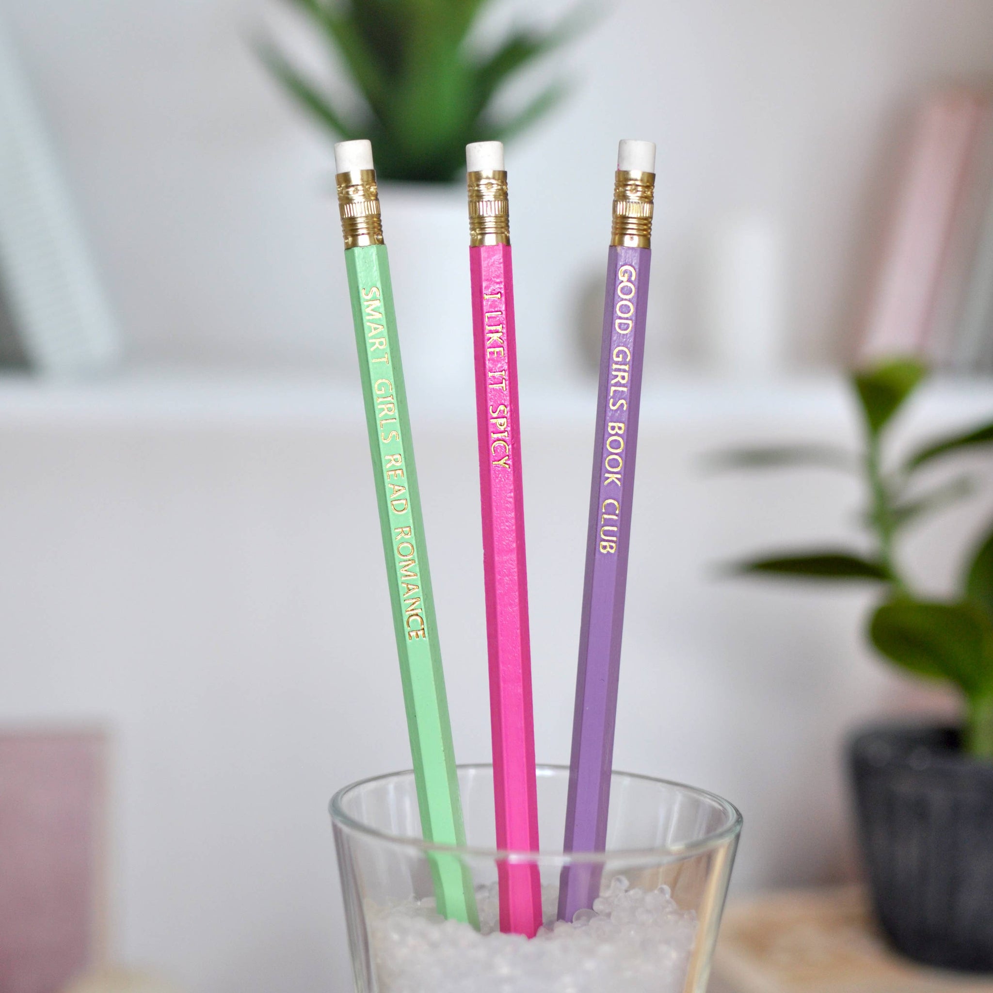 Celebrate your love for romance novels with this charming Romance Pencil and Bookmark Set! Perfect for romance readers who enjoy everything from sweet love stories to spicy page-turners, this set includes three colorful pencils with playful phrases: