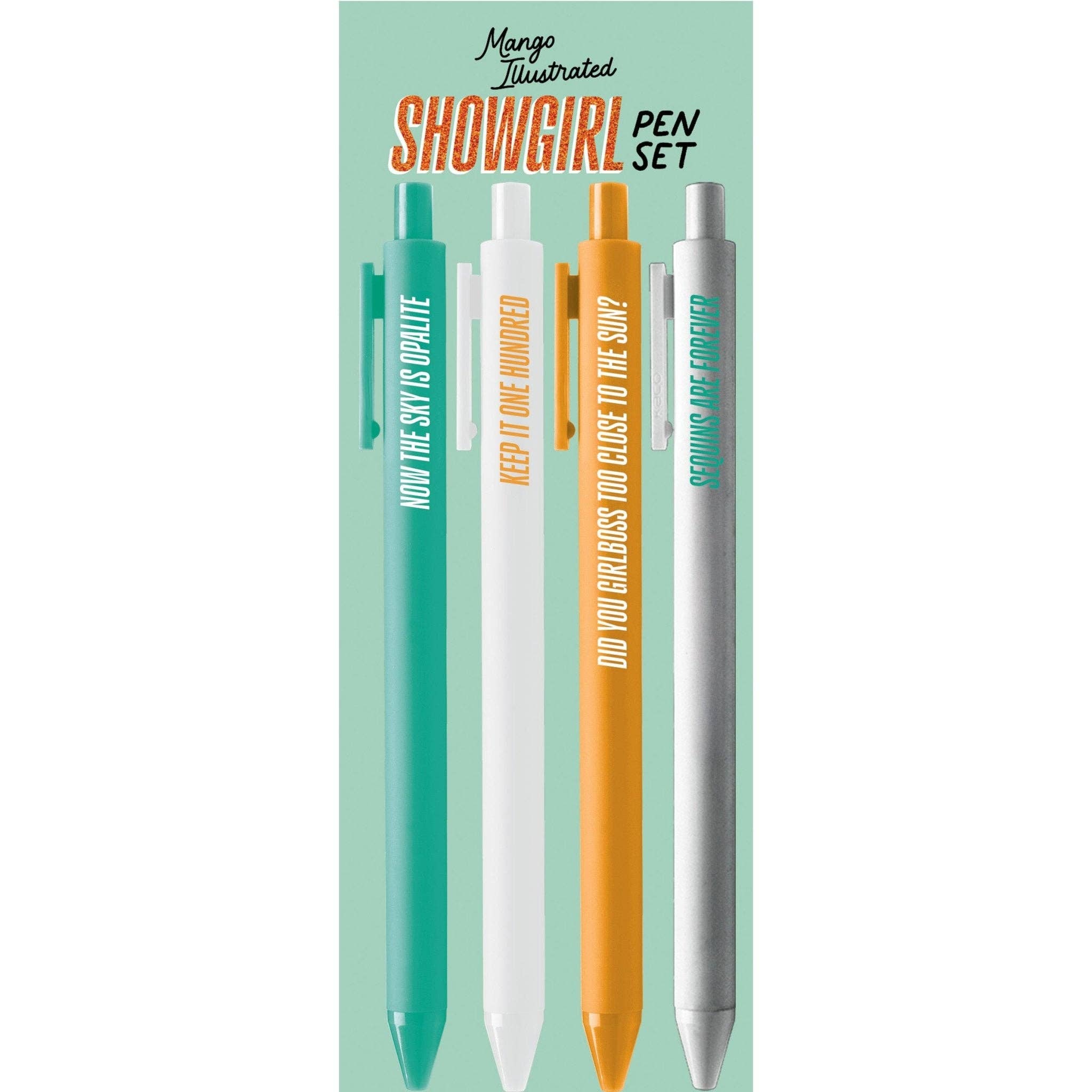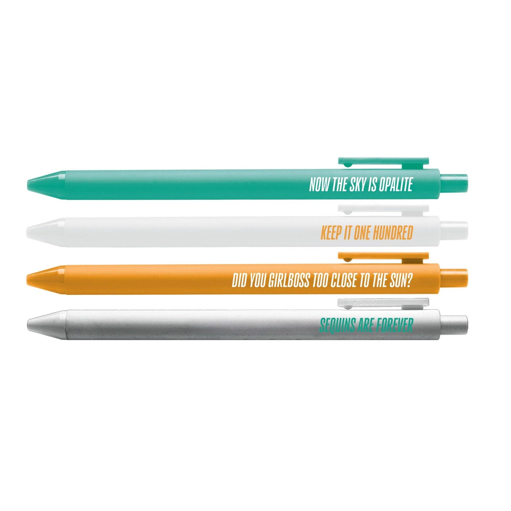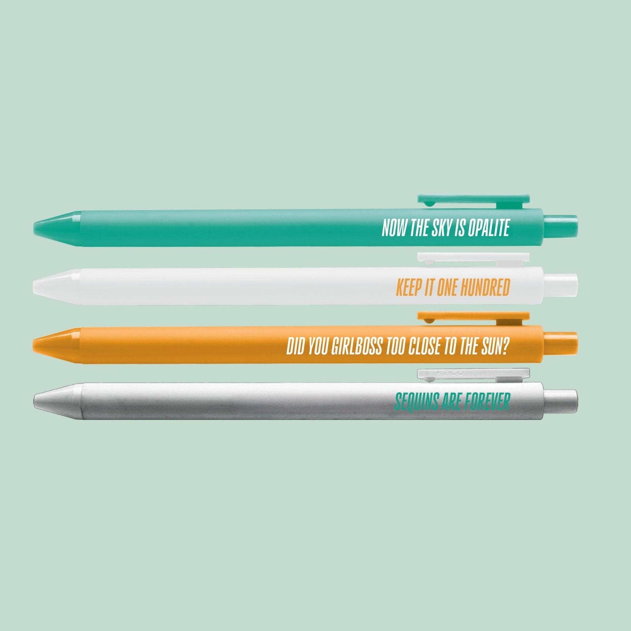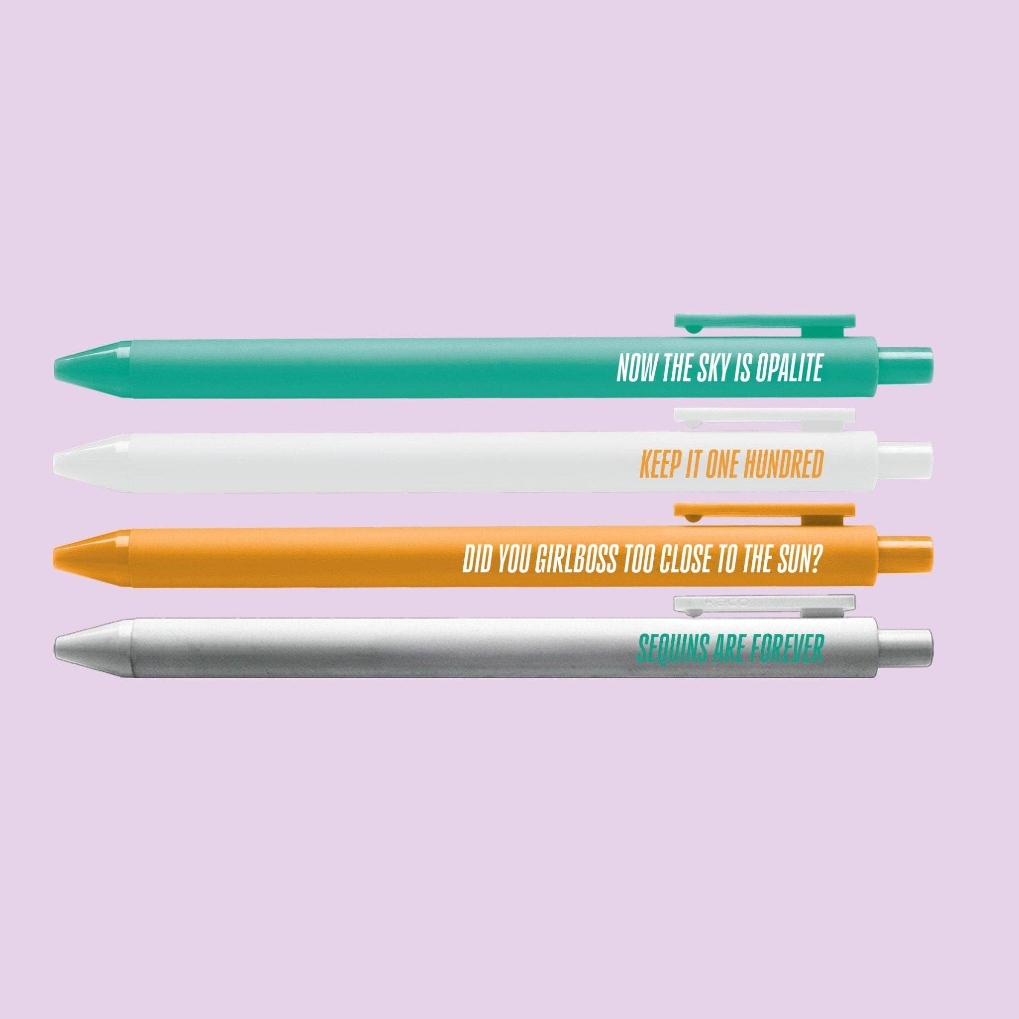 PRE-ORDER Please note these will not ship until late October/ early November 2025. Any in stock products you order with the pre-order pens will ship with the pens. - Set of 4 pens with black gel ink - Packaged in a cello sleeve with card backing Pens included: Now the sky is Opalite - teal barrel, white text Keep it one hundred - white barrel, orange text Did you girlboss too close to the sun? - orange barrel, white text Sequins are forever - silver barrel, teal text
